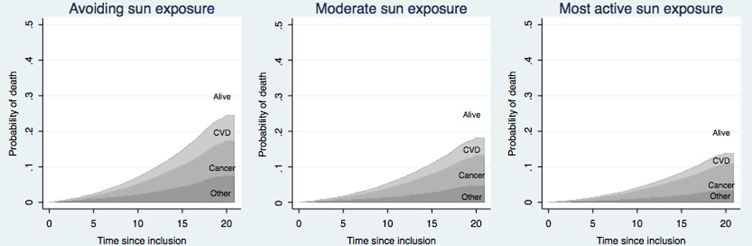 And then came the slow, but inexorable, one-hundred-and-eighty-degree turn. The sun began to be viewed as dangerous. From ‘healing sun’ to ‘bringer of death’. Has this been a good move? In my opinion, absolutely not. Let me show you a graph from a long-term study done in Sweden. It looks at probability of death, in three groups.